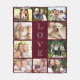 Uma elegante colagem de fotos vermelho-burgundy mantinha o cobertor que sua família vai tesourar e curtir por anos. Personalize com 10 fotos da família. "LOVE" é escrito verticalmente no meio, em tipografia branca aberta.