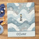 Este adorável cobertor personalizado náutico apresenta um farol confortável com ondas geladas e flocos de neve.