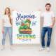 Design vibrante e colorido com um livro aberto, dragão colorido e flores. O texto colorido diz: "Feliz quando leio". Esse design está disponível em uma grande variedade de produtos.