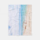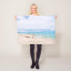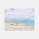 "Seas and Greeting" dizendo em Sandy Beach. Captivando barco de pesca preguiçoso na praia com aqua-color oceano azul e céu ensolarado acima.
