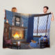 Um canto aconchegante num dia de inverno nevado, com um gato gengibre sentado olhando para o fogo brilhante. Ao redor da lareira estão cadeiras-de-braços suaves, com velas brilhantes e pilhas de livros e uma caneca a vapor para completar o conforto. Fora de um salgueiro coberto pela geada, a cobertura de faia é obscurecida pela queda da neve.