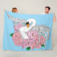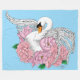 Um cisne branco cercado por flores cor-de-rosa num pano de fundo azul