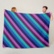 Um cobertor de velo de grande porte que apresenta um padrão colorido design de faixas diagonais em azul legal, azul-oceano, azul marinho, roxo de ameixa e lavanda.