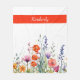 Este vibrante cobertor de fleece personalizado com flores silvestres em aquarela apresenta um padrão com uma mistura animada de flores em tons de joia roxos, laranja e vermelhos, combinados com uma tipografia moderna e elegante.