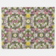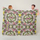 É um cobertor de velo com uma ilustração de uma variedade de flores pequenas. Há rosas, margaridas, lírios e tulipas em diferentes cores, como violeta, branco e rosa.