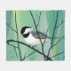 Galinha com tampas negras sobre um galho nu com um fundo abstrato de luz solar brilhando através da floresta