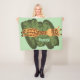 cobertor de velinha girafa amarela e castanha. Nome personalizado com fundo verde e folheado num cobertor de mar.