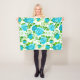 Rosas azuis pastel com folhas verdes sobre fundo branco.