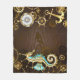 Fundo de madeira castanho com fundo marinho, cordilheira mecânica, volante antigo, âncora de ouro e diversas engrenagens de ouro e latão. Estilo Steampunk.