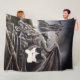 O gatinho de smoking preto e branco está sentado ao lado de um gárgula. Atrás deles está um castelo e dragões.