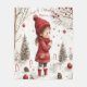 Menina adorável vestindo um casaco vermelho, chapéu e botas. Ela está lá fora na neve decorando as árvores com ornamentos vermelhos. Ela adicionou doces na neve. Tão fofo. Personalize se quiser.