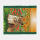 Uma leoa majestosa senta-se antes de um campo dos girassóis e das papoilas, as flores do zodíaco de Leo.