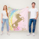 cobertor de Unicórnio com um belo unicórnio dourado sobre um fundo pastel de arco-íris rosa. Este bonito cobertor unicórnio é facilmente personalizado simplesmente adicionando o texto de sua escolha no estilo de fonte preferido. Você também pode mudar a cor de fundo neste adorável cobertor unicórnio. Este é um design impresso sem brilho real, folha de alumínio, etc.