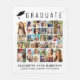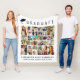 A elegante graduação em branco mantém um cobertor para celebrar o formando com "FORMANDO" no topo em letras grandes, uma ilustração de um boné de formatura, uma colagem de 30 fotos para comemorar sua família, amigos e conquistas, e seu nome, ano de aula e escola em tipografia serif clássica.
