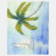 Praia Tropical. Iate no mar Palma num dia ensolarado. Aquarela. A ilustração da aquarela foi desenhada e digitalizada. A imagem será um bom presente e uma decoração interior maravilhosa.