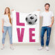 Love Soccer word design com letras faíscas cor-de-rosa quente e o "o" é substituído por uma bola de futebol.