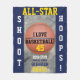 I Love Basball é escrito em tipografia negra contra basquete laranja no centro em um legal fundo de concreto brilhante. Fundo azul marinho. Época escolar Ano escrito em branco. All-Star, Player Number e Name escritos em tipografia de cor dourada amarela. Para alterar a cor do plano de fundo para a cor do grupo, clique em Personalizar e clique em Fundo no lado esquerdo e selecione na paleta de cores ou digite um número de cor de código hexadecimal. Para alterar o Nome da Escola e Mascote que correspondem à cor da fonte Azul para a cor da sua equipe, clique no campo Camada de texto no lado esquerdo e selecione na paleta de cores de texto no lado direito. Shoot Hoops está escrito em branco. Texto original de basquete dizendo modelo e Fotografia © 2017, 2018 TamiraZDesines.