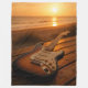 Uma guitarra repousa pela costa enquanto o pôr do sol pinta o horizonte em tons dourados quentes. A combinação perfeita de música e natureza, transmitindo calma, inspiração e a sensação de que cada acorde ressoa com a luz que desvanece da noite.