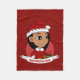 Jogue cobertor com uma ilustração de uma menina Latina/Hispânica ou asiática, sorridente e feliz, de cabelo longo e preto, que está vestida de Natal e veste um chapéu vermelho de Papai Noel e segurando um presente; design de Natal em fundo vermelho, com um texto editável modelo de seu nome ou mensagem