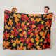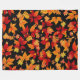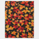 Autumn Midnight, mostra um padrão vibrante de folhas do outono em um fundo preto. As folhas são uma mistura de tons vermelhos, laranja, amarelo e dourados, representando uma variedade de espécies como carvalho, carvalho e castanheiro. "o contraste entre as cores vívidas das folhas e o fundo escuro cria um efeito marcante e dramático, enfatizando os tons quentes e o detalhe intrincado da folhagem. folhas menores, bolotas e galhos são espalhados ao longo, acrescentando profundidade e textura ao padrão. A design tem um sentimento enérgico e festivo de uma noite viva de outono.