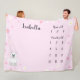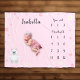 Um cobertor de bebê, bonito e cor-de-rosa, com ursinho branco doce. Flores e estrelas de decoração. Você pode especificar quantos meses ou semanas de idade o bebê tem, e também pode marcar a idade separadamente.