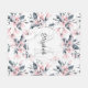 Um cobertor personalizado com um padrão elegante feito com ilustração aquarela de flores cor-de-rosa com folhas e caules de cinza azul. Um círculo branco colocado sobre o topo com seu nome e dentro inicial monograma.