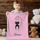 O cobertor macio e aconchegante mostra uma silhueta de um gato preto, parado com cauda enrolada acima da cabeça do gato. Personalize e personalize o nome mostrado abaixo do gato em uma fonte de script elegante. Altere a cor de fundo rosa padrão. Felino bonito, na moda, moderno e legal para amantes de gatos, amantes de os animais, veterinários, novos bebês, crianças e novas mães. Faz um presente de excelente.