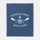 Âncora náutica e remos cruzados com o nome da família personalizada e o lago ou casa de praia em um cobertor azul de velo Marinho personalizável.