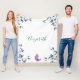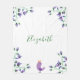 Simples e elegante para sua casa de verão. Um fundo branco elegante decorado com flores violeta, azul roxo e um pequeno pássaro cantando. Modelo para o seu nome. O nome é escrito com uma escrita verde moderna escrita à mão.
