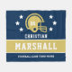 Um cobertor personalizado de futebol temido de velo para jogadores quando eles não estão marcando touchdowns no campo, e para seus pais apoiarem seus filhos e ficarem quentes em jogos infantis! Faz um presente de equipe único. Design apresenta um capacete de futebol personalizado com o número uniforme do jogador, texto personalizado para o primeiro e sobrenome do jogador e texto moderno para o nome da equipe. Na moda e design moderno apresentam letras de camisa de varsity esportivas e faixas simples horizontais com sotaques estelares. O esquema de cores de azul, marinho e branco pode ser modificado para coordenar com as cores da sua equipe.