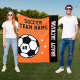 O cobertor personalizado do futebol temido pula para jogadores de futebol quando eles não estão marcando gols no campo, e para os pais apoiarem seus filhos e ficarem quentes em jogos frios! Faz um presente de equipe único para torneios de viagem. Design apresenta uma bola de futebol personalizada com o número uniforme do jogador, texto personalizado para o primeiro e sobrenome do jogador e texto moderno para o nome da equipe do clube de futebol. Na moda e design moderno apresentam letras de camisa de varsity esportivas e faixas simples horizontais com sotaques estelares. O esquema de cores de cor laranja, preto e branco pode ser modificado para coordenar com as cores de sua equipe.