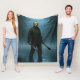 L’image occupe toute la surface de la couette. Au centre, la silhouette imposante de Jason Voorhees semble émerger directement du matelas, ses pieds plongés dans une eau sombre qui s'étend jusqu'au pied du lit. Le dégradé de bleu profond et de brume crée une atmosphère glaciale qui transforme la chambre en une extension de Crystal Lake. Le tissu aurait un fini mat pour accentuer l'aspect lugubre de la forêt en arrière-plan, tandis que le rouge vif du sang sur les machettes apporterait une touche de couleur contrastante et percutante.