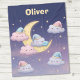 Este cobertor de velo personalizado apresenta nuvens de cor pastel vestindo minúsculas paisagens, descansando pacificamente sobre e ao redor de uma lua crescente. Cercado por estrelas brilhantes e um gradiente macio de azuis profundos, púrpuras e pinks, esta cena noturna tranquila é perfeita para berçários e quartos de crianças.