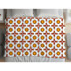 Towel set with a pattern of orange and yellow sunflowers alongside red geometric crosses, hanging on a metal bar; matching washcloth laid flat.