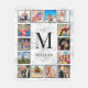 Crie seu próprio cobertor personalizado de 12 fotos com colagem de velo com suas imagens personalizadas, monograma e nome em um fundo na moda elegante de mármore branco.