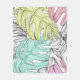 Um bonito pastel, aquarela, parece impressão de folha de palma. Em cores de azul-aqua, rosa-coral e amarelo-limão em fundo branco. Luz, areia e elegante.