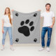 Simples silhueta de pata preta no meio e pequenas silhuetas de pata de cachorro em cada canto do cobertor. A cor de fundo é cinza.
