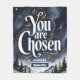 Uma pintura aquosa de um céu azul-marinho com estrelas. O texto "Você é Escolhido" é escrito em estilo elegante e ousado de caligrafia. Há sotaques de ouro sutis e moldes em volta do texto e do céu. O fundo é uma paisagem serena com montanhas e árvores... personalizada com o nome.
