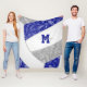 Essa peculiar manta de velo tem a imagem realista de um vôlei de tamanho absurdo que tem painéis azuis, cinzas e brancos - um padrão contínuo de rabiscos de paisagens, flores e penas em cobrir brancos os painéis não-brancos do vôlei - personalize com o nome e o monograma do atleta, a letra da varsidade ou o número da camisa - de katz_d_zynes