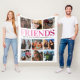 Um cobertor personalizado de amizade pessoal, com um fundo branco chic que pode ser mudado para qualquer cor, 9 fotos de você e sua melhor, a palavra "amigos" em um gradiente rosa tendencioso, seus nomes e uma citação de amizade editável.