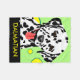Arte colorida do cão que caracteriza o Dalmatian branco com pontos pretos contra uma luz - o fundo verde e os círculos amarelos, nome da raça imprimiram no fundo preto