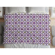 Towel set with a purple and white geometric floral pattern hanging on a rod. Below, a washcloth shows the same design with a folded corner.