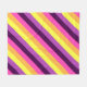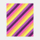 Um cobertor de velo de tamanho médio que apresenta um design de padrão bonito e colorido de faixas diagonais em púrpura, lavanda, amarelo-limão, laranja-melão e magenta brilhante.