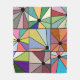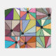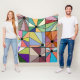 Este cobertor de velo médio tem um desenho abstrato que é feito de nove quadrados com um círculo e "raios" saindo do círculo em muitas cores diferentes.