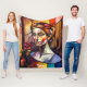 Um retrato abstrato impressionante de uma mulher em estilo de vidro manchado, acentuado com uma rosa vívida. Cores negros e formas geométricas criam um texto moderno, artístico.