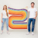 This artwork channels a retro graphic spirit, forming the letter‑like curve with parallel bands of red, orange, yellow, light blue, teal, and purple. The layered arcs flow in harmony, evoking the bold optimism of 1970s design. Set against a soft beige background, the vibrant rainbow palette stands out with clarity and rhythm. The composition balances simplicity and dynamism, creating a timeless visual that feels both nostalgic and modern.