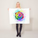 Rosa grande e florescente com pétalas arco-íris sobre fundo branco, pintadas com pedaços de tinta colorida e brilhante. 3d