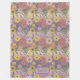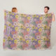 É um cobertor de velo com uma ilustração de uma variedade de flores com diferentes formas, tamanhos e cores. Há rosas, margaridas, girassóis e lírios. As flores são dispostas em um padrão circular, com um gradiente de matizes cor-de-rosa, laranja e amarelo. O fundo é uma matiz roxa suave.