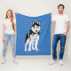 Este cobertor personalizável apresenta um Husky Siberiano preto e branco contra um fundo azul. A cor de fundo pode ser alterada para se adequar ao seu gosto individual.