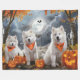 Libere o espírito assustador com esta design sombria do Dia das Bruxas apresentando um bando de cachorros sob um céu escuro e iluminado, cercado por morcegos voadores e abóboras brilhantes. Perfeito para aqueles que amam um toque de diversão terrível com seus amigos peludos!